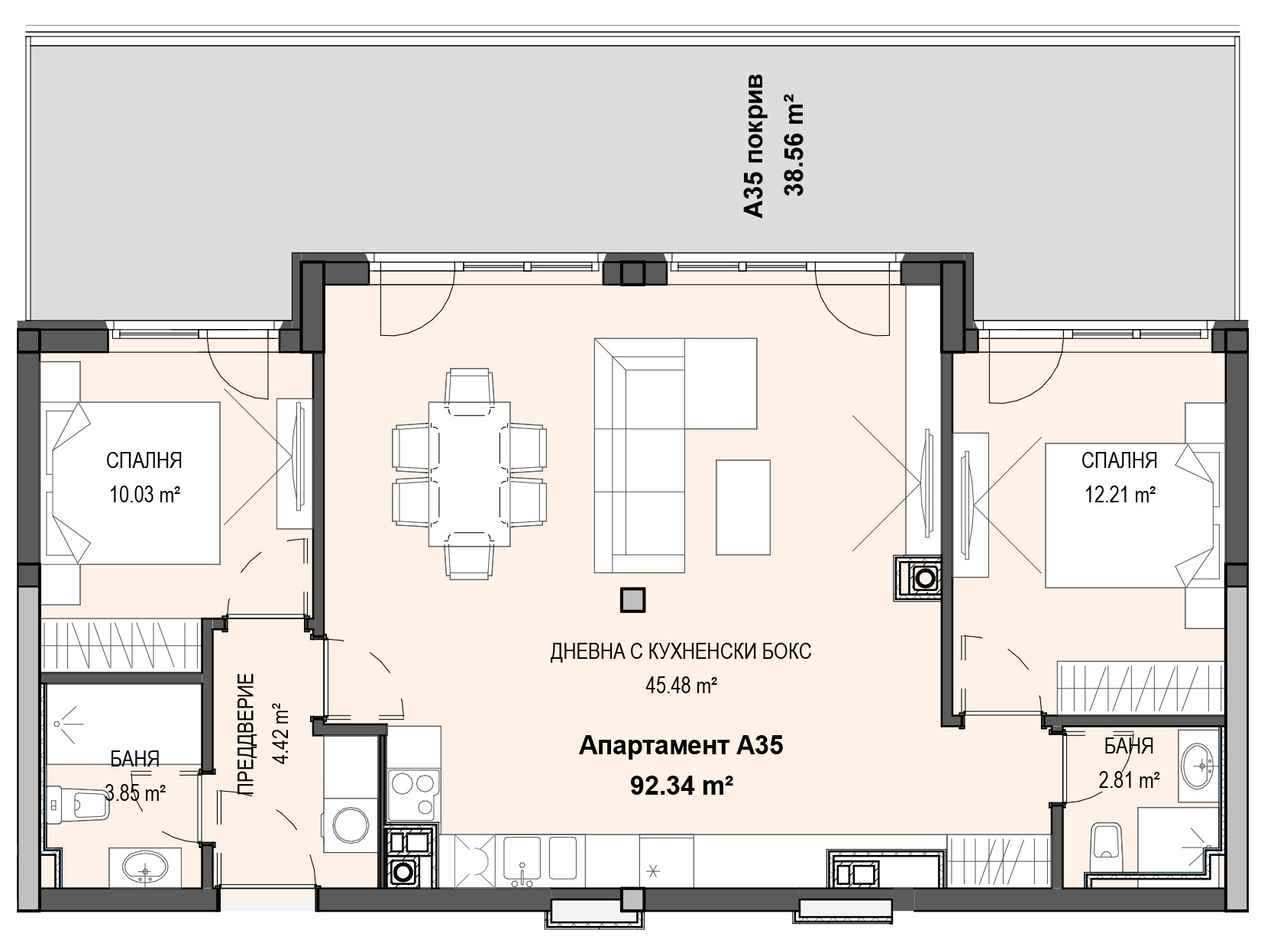 Предложеният апартамент е с обща площ 106.44 кв.м., от които 92.34 кв. м. светла площ. Дневната е със завидните 45, 48 кв. м. площ. Широк и просторен хол с кухненска част, а френските прозорци ви водят към съвършената тераса с гледка към „Копитото“. Освен това разполагате с 2 спални и 2 бани.
